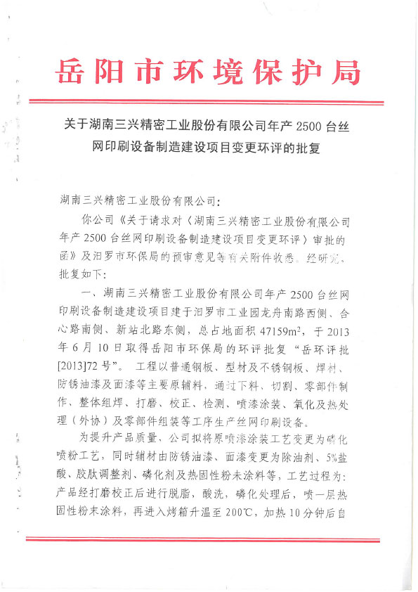 三兴丝网印刷设备制造建设项目批复报告